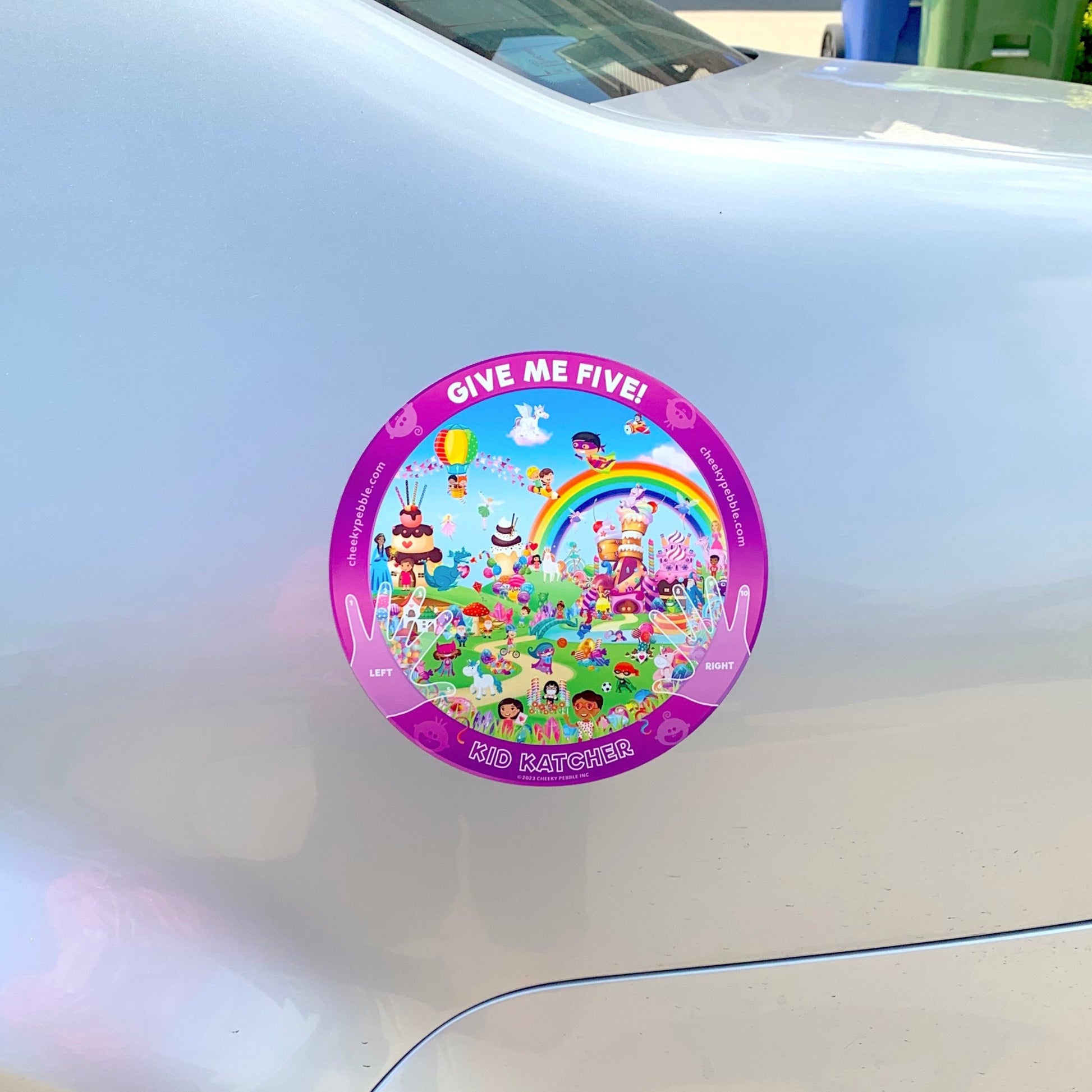 Large 8 x 8 inch round, weatherproof magnet that attaches to the outside of your vehicle at toddler eye-level.