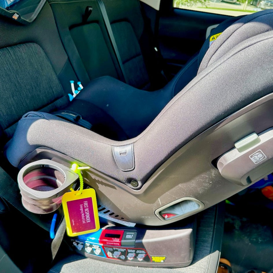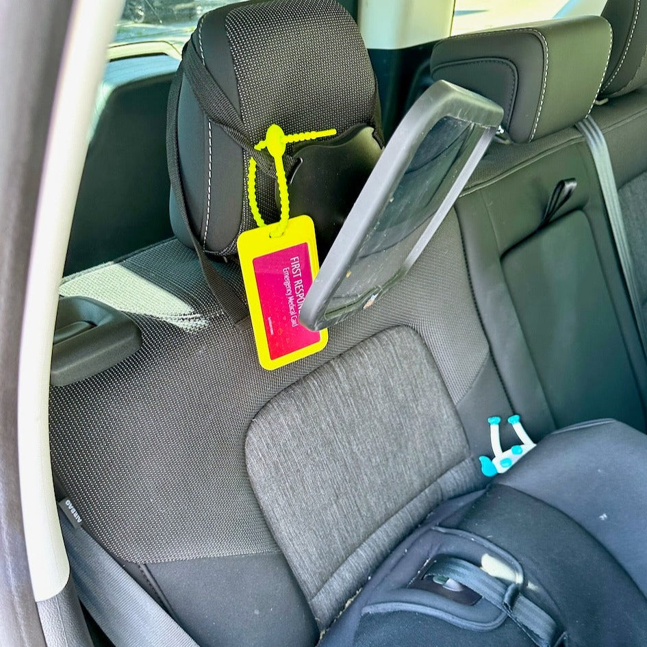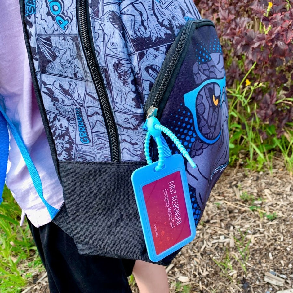 A business-card sized booklet containing important medical information that First Responders need to assist effectively and timely. The booklet is stored inside a brightly coloured, easy-to-see plastic case with flexible twist tie.